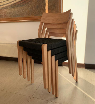 Una ligera estructura de madera, suave al tacto y a la vista, se completa con un asiento encordado negro formando una textura en movimiento, blanda y consistente. El respaldo curvo de madera es el apoyo final para una postura cómoda y relajada en cualquier espacio de nuestra casa.